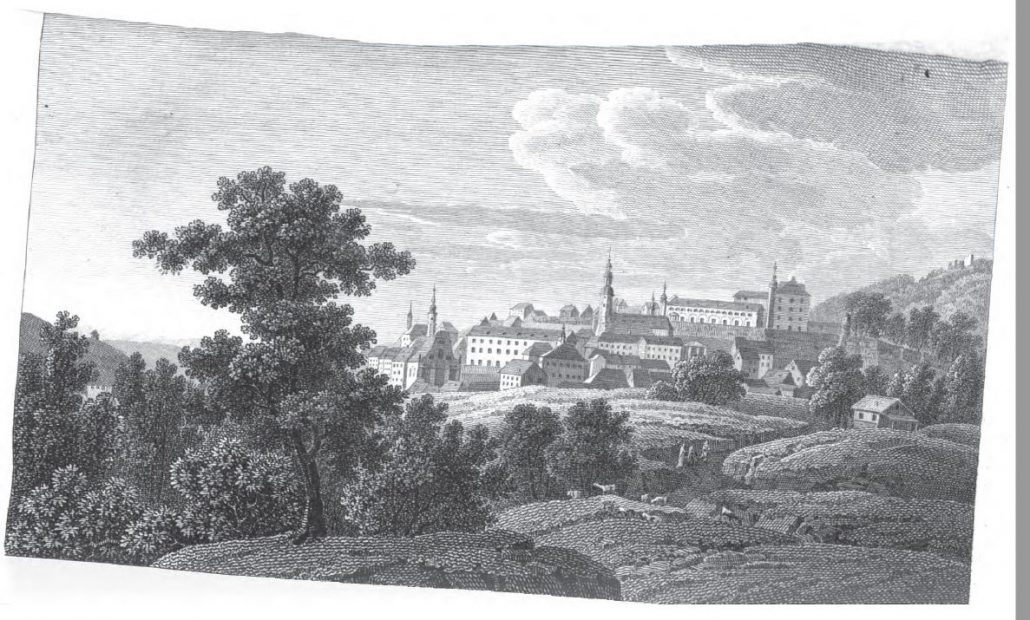 Leider ist nicht bekannt, von wem der Kupfersticht der Stadtansicht ist, da das Buch nicht im Original vorliegt. Es handelt sich aber um eine Süd-Ost Perspektive, die in den nächsten Jahren von den meisten Künstlern bevorzugt wurde, also vom Annaberg, oder damals als Häslich bezeichnet. Aus dieser Perspektive hat man insbesondere bei Nachmittagssonne den besten Blick auf die Hauptgebäude der Stadt. In der späteren Publikation „Baden in malerischen Ansichten“ zusammen mit Frommel von 18xx wird er dazu schreiben: „xxxxxxxxxxxxx Amphitheater“. Da aber das neue Konversationshaus noch nicht gebaut war, beschränkt sich der Blick auf die Altstadt. Bauhistorisch kann man damaligen Zustand der Gebäude gut nachvollziehen und somit auch umgekehrt ungefähr abschätzen, wann eine Ansicht erstellt wurde. Auf der linken Seite erkennt man den im Jahre 18xx umgestalteten Kirchturm des Jesuitenkollegs und die Frontpartie. Zudem kann man erkennen, dass der 1809 auf dem Vorhügel gebaute Pavillion Huvellin – das spätere Haus der Großerzogin Stephanie – noch gar nicht gebaut war. Im Hintergrund kann man rechts unterhalb der Stiftskirche auch den Giebel der 1804 erbauten Antiquitätenhalle erkennen. Wen man die genaue Standortachse ermitteln will, kann man die Überlappung von hinterem Schiff der Stiftskirche und dem Eingangssturm des neuen Schlosses nutzen. In der Verlängerung der beiden Punkte kommt man ungefähr beim Standpunkt des heutigen MLG Gymnasiums raus. Aufgrund der dichten Bebauung kann man sich die Sicht heute kaum mehr vorstellen. Um den Standort des Maler zu erahne, hilft es, sich die Stadtkarten der damaligen Zeit anzusehen. Aber zunächst zurück zu dem Maler bzw. Stecher der Bildes.