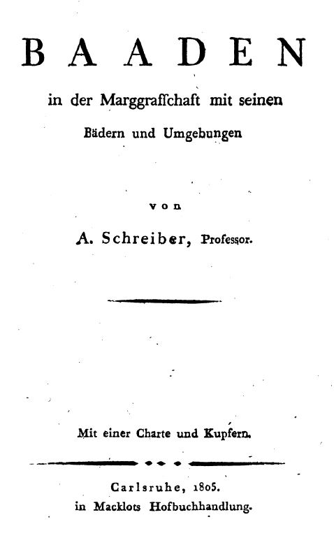 Die Quellenlage gibt leider keine Auskunft darüber, wie er zu seiner ersten und für Baden-Baden bedeutsamen Stadtbeschreibung aus dem Jahr 1805 mit dem Titel „Baden in der Marggraffschaft mit seinen Bädern und Umgebungen“ gekommen ist, aber der Umfang des Werkes legt nahe, dass es sich um ein längerfristig geplantes Projekt gehandelt haben muss, zumal es beim damals führenden Karlsruher Hofdrucker Maklot aufgelegt wurde. Gleichzeitig nutze er seine detaillierten Kenntnissen über seine Heimat „Baden bey Rastatt“ dazu, den aufstrebenden Markgraf und späteren Großherzog Karl Friedrich bei der Aufwertung von Baden-Baden als präferierten Kurort im Reich, noch vor den Kurorten xx und yy, zu unterstützen. Der 1803 zum Kurfürst erhobene Karl Friedrich hatte beim renommierten Hofarchitekten Weinbrenner die Renovierung des alten Promenadenhauses von 17xx (der Neubau des heutigen Konversationshauses kam erst 1825) und die Erneuerung des alten Bäderviertels rund um die Stiftskirche beauftragt. Schreiber bot an, eine erste umfassende Stadtbeschreibung überhaupt zu erstellen, um die potenziellen Gäste von der Schönheit der Stadt, aber auch seiner landschaftlich reizvollen Umgebung zu überzeugen. Schreiber und Weinbrenner standen in Karlsruhe in engem Austausch unter anderem beim Badischen Kunstverein und der Lesegesellschaft.